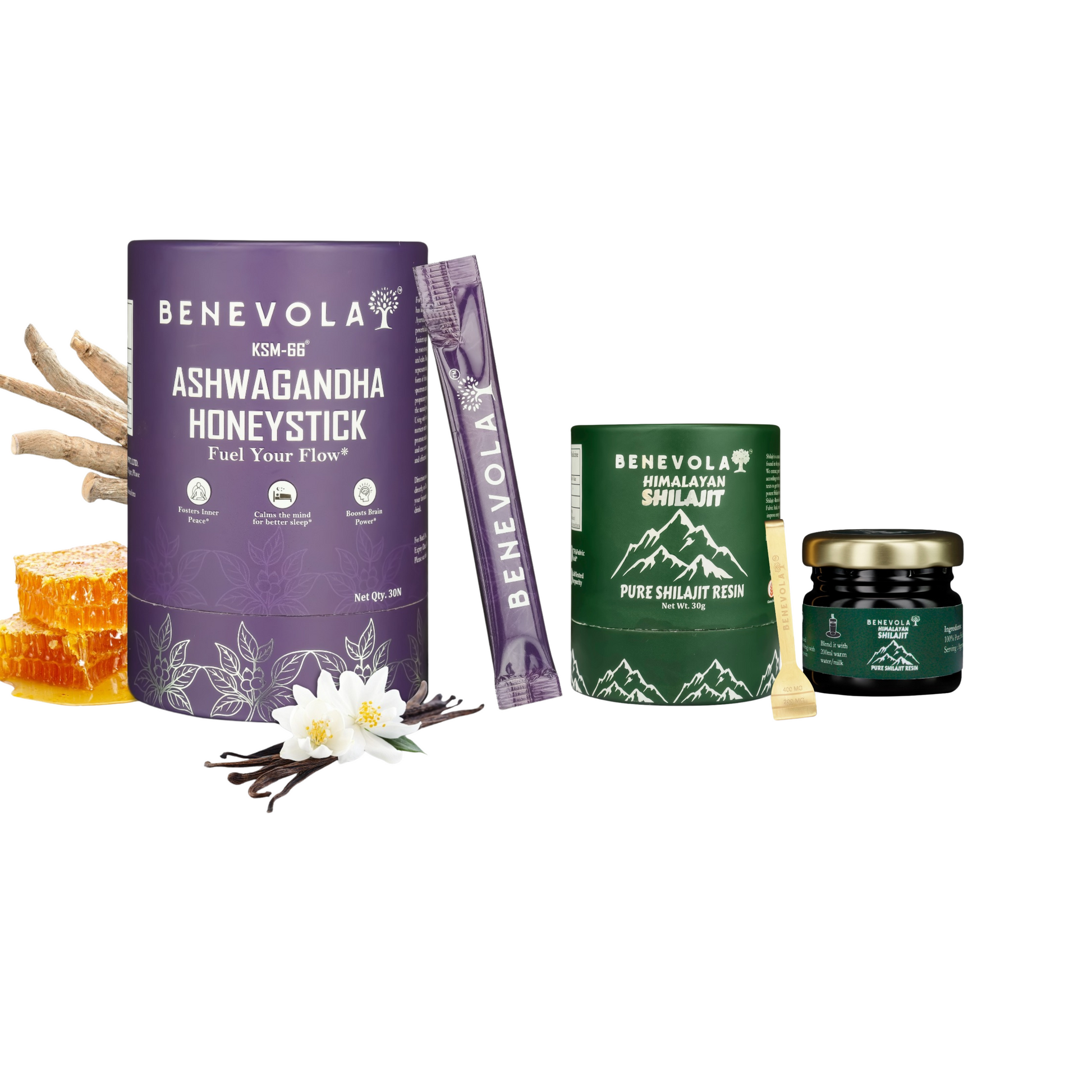 Discover the ultimate balance of strength and calm with the Benevola Vitality Combo. This wellness duo combines the calming adaptogenic power of Ashwagandha Honeysticks with the pure potency of Himalayan Shilajit Resin, bringing together two timeless Ayurvedic treasures in their purest forms.